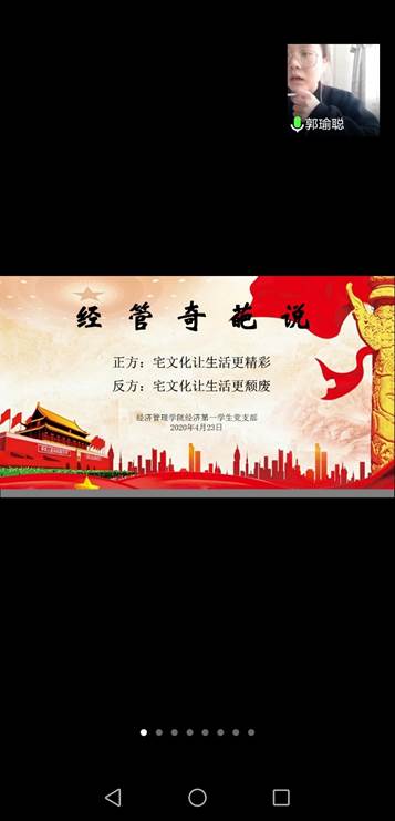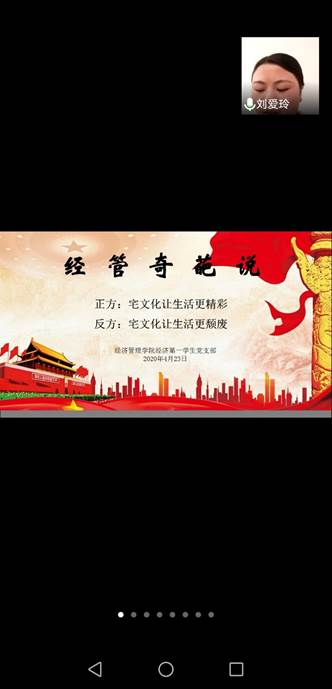 为提升支部成员独立思考能力以及语言表达能力,同时增添组织生活会的多样性,在疫情特殊时期,经济第一学生党支部于2020年4月23日星期四在腾讯会议上开展了本学期第二次辩论赛活动。“云辩论”以“宅文化使生活变得更精彩还是更颓废”为主题展开讨论,力求让每一位学生党员能够在疫情期间感受身边所处环境的变化,并在变化的环境中保持不断学习的精神面貌。