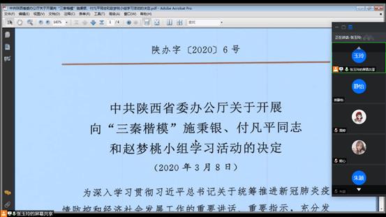 为深入学习贯彻习近平总书记关于统筹推进新冠肺炎疫情防控和经济社会发展工作的重要讲话、重要指示,充分发挥先进典型的示范引领作用,积极践行社会主义核心价值观,培养担当民族复兴大任的时代新人,按照上级党组织关于开展向“三秦楷模”施秉银、付凡平同志和赵梦桃小组学习活动的要求。2020年5月26日,工商第二学生党支部全体党员共同学习了“三秦楷模”施秉银、付凡平同志和赵梦桃小组先进事迹。