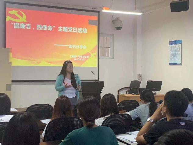大会伊始,邵欣老师向同学们介绍了本次党日活动的主题旨在营造风清气正的支部环境与氛围,希望大家能通过阅读书籍真正洗涤心灵发挥党员廉洁自律的模范带头作用。接下来,各党小组分别选派代表为大家分享本组在这个月关于党风党纪方面的读书成果,其中谢昌峰向支部成员们分享了《长征》这本书令人印象深刻,书中讲述了在长征过程无数的中国共产党员的感人事迹,尤其是党员干部宁愿牺牲自己也要将粮食留给自己战友的故事不禁让我们更加珍惜现在的生活。
