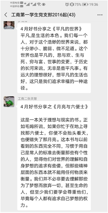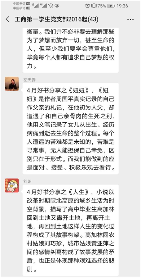 为营造支部浓厚的文化氛围,提升支部成员的文化素养,传递阅读精神,培养阅读习惯,打造书香港口,304am永利集团官网工商第一学生党支部开展了以“书香润党建、阅读伴成长”为主题的系列主题党日活动。4月29日是该系列活动的第一期——“世界读书日之我枕边的一本书”。时值疫情期间,支部成员只能在在微信群中进行线上交流,但冰冷的屏幕并没有阻隔大家的分享热情,活动顺利进行。