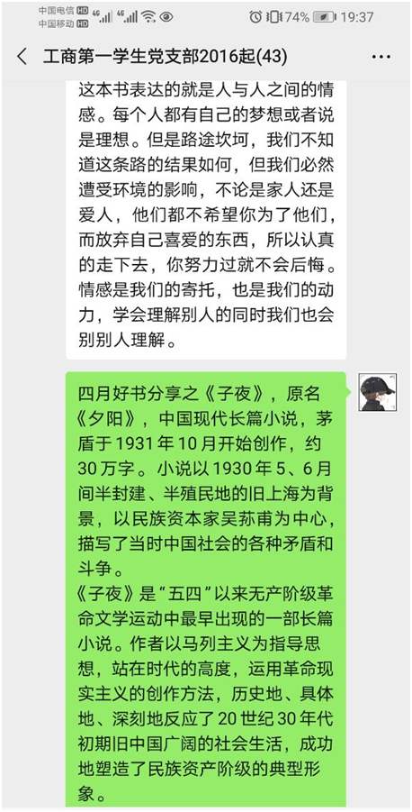 本次读书分享会在题材并不设限,“枕边的一本书”不仅仅代表着阅读者对它的喜爱,更是会让阅读者精神放松,完全在书海中遨游与畅想。所以支部成员纷纷拿出了自己压箱底的好书,将自己澎湃的感想凝练成一段段文字分享在群里。