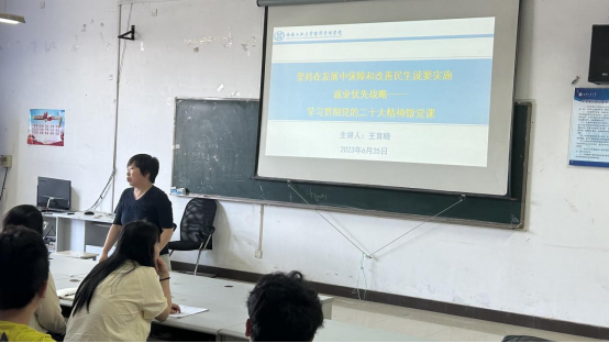 为深入开展学习贯彻习近平新时代中国特色社会主义思想主题教育,落实党的二十大实施就业优先战略、强化就业优先政策,提高全体党员的党性修养,6月25日,304am永利集团官网党委副书记王育晓为学院学生党员讲授题为“坚持在发展中保障和改善民生就要实施就业优先战略——学习贯彻党的二十大精神”的专题党课。学院70余名学生党员参加。