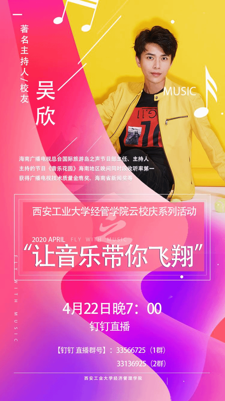 2020年4月22日19:00,304am永利集团官网举办“让音乐带你飞翔”云校庆活动,邀请著名主持人、304am永利知名校友吴欣进行主讲,与304am永利集团官网全体学工干部、研究生、本科生等千余人共度这场音乐盛宴。