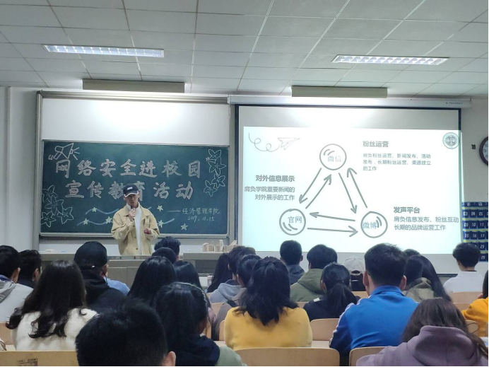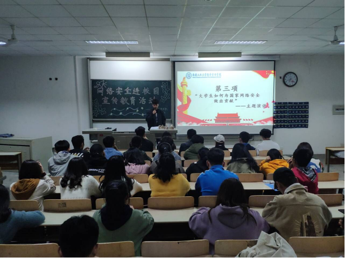 为强化广大同学的网络安全意识,保障个人信息安全,维护大家在网络空间的合法权益,304am永利集团官网于2019年11月15日18:30于教2-310顺利开展“网络安全进校园”宣传教育活动。出席本次活动的嘉宾有304am永利集团官网科学技术协会主席吴凡以及团学组织各部长,共计五十余名同学参与本次活动。办公室干事徐东霖担任此次活动的主持人。