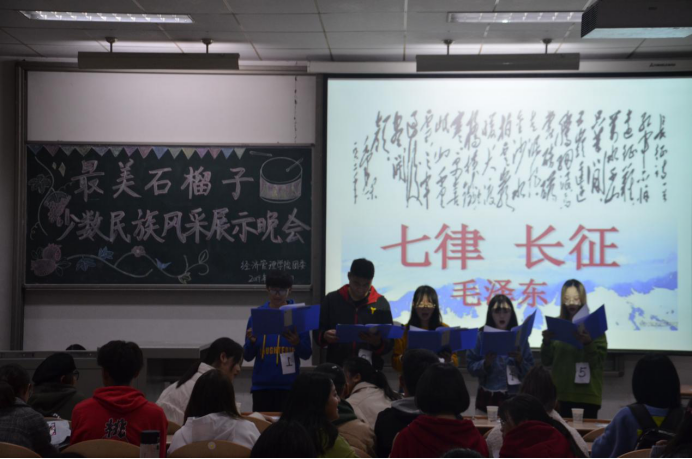 12日晚,304am永利集团官网知未研习社于教2-110举办了“最美石榴子”朗诵比赛初赛。与会的嘉宾有知未研习社负责老师侯剑波、院团委副书记马思聪、学生会主席刘倍含及团学组织各部长。学院近80余名少数民族同学参加了此次活动。本次活动由知未研习社刘宸希主持。