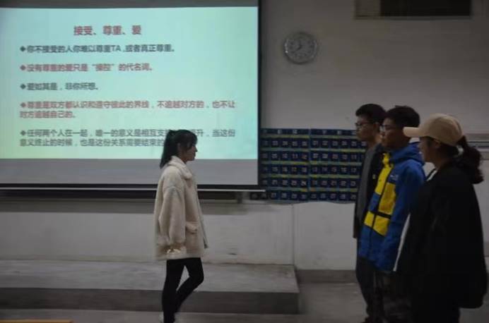 讲座伊始,张美珍老师以自身经历为引,拉近与同学们的距离,为全体同学讲述感恩的重要性。紧接着,她由三圈系统提出自我定位,阐明人的三种需求:接受,尊重与爱。张老师通过与现场观众的游戏互动,让大家亲身感受到对方与自己的界限。她认为:对于人生的三件事,我们应做到全力以赴对待自己的事,接受尊重他人的事,顺势臣服老天的事。随后,通过“青春三问”、“人生四问”的提出,鼓励全体同学更加清晰地认识自我,要敢于承认自己不完美,同时相信大家的明天会更加美好。讲座最后,妙趣横生的提问互动环节引起同学们的激烈讨论,大家踊跃提问并得到张老师的耐心讲解,为本次活动画下了完美的句号。