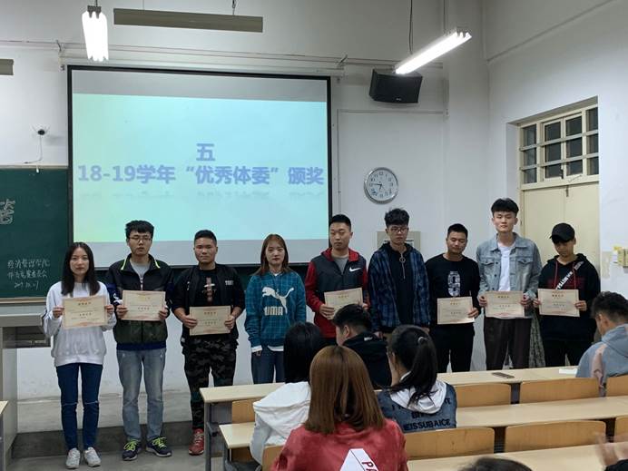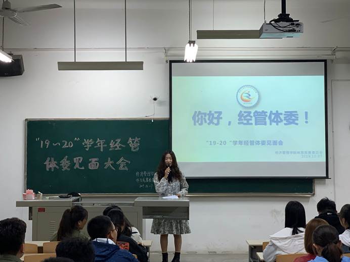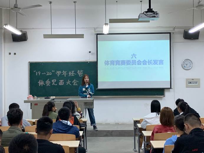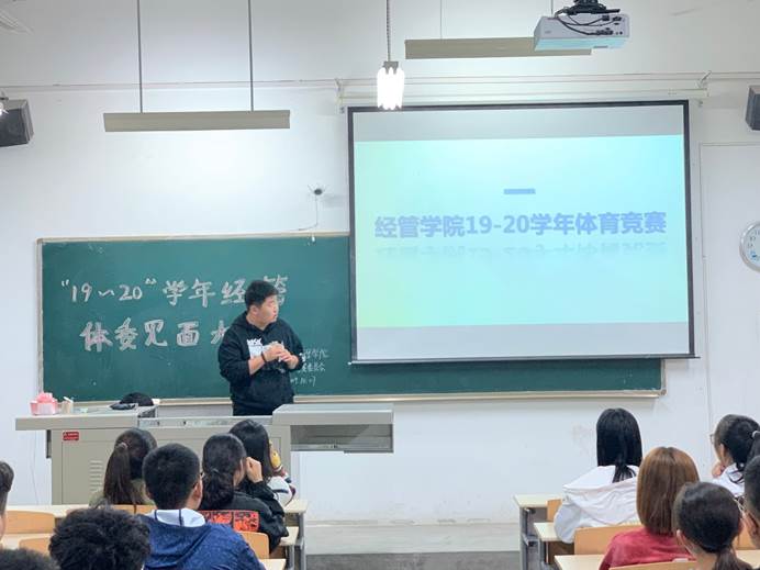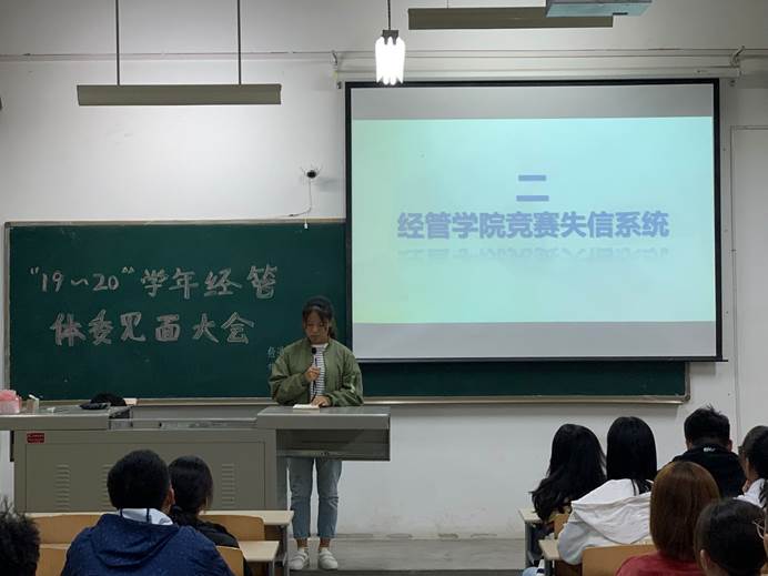活动伊始,由体育竞赛部部长韩昌东介绍2019-2020第一学年校内及省级运动竞赛计划,用简明的表格来使各体委了解本学年大致工作内容。紧接着,由体育竞赛部副部长张晓玉介绍经管学院竞赛失信系统以及竞赛信息收到干事负责制,通过简单的介绍使大家了解工作流程及重要性。在体育竞赛部部员进行自我介绍后,由权益部部长介绍权益部工作事宜。接着由体育竞赛委员会会长对18-19学年“优秀体委”进行颁奖表彰。最后,体育竞赛委员会会长进行发言总结。