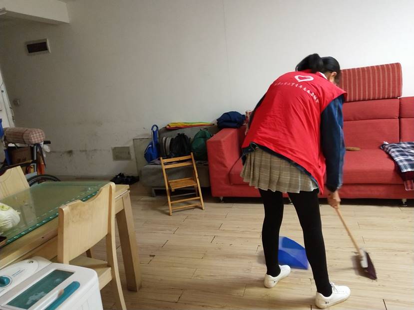 早八点在图书馆前集合完毕后,志愿者们乘坐公交车来到佳家社区。此次活动立足于整个社区,以空巢老人为重点服务对象,希望能为社区中每一个遇到困难并渴望寻求帮助的老人送去自己的关爱。活动过程中,志愿者们帮助老人整理内务、清洁房间、打扫卫生死角,通过表演节目、讲笑话的方式来使老人开心。欢声笑语充满了整个房间,为骤凉的秋日带来了温暖。快乐的时光总是短暂的,在临别之际志愿者们提醒老人注意身体并与老人相约下周再见。
