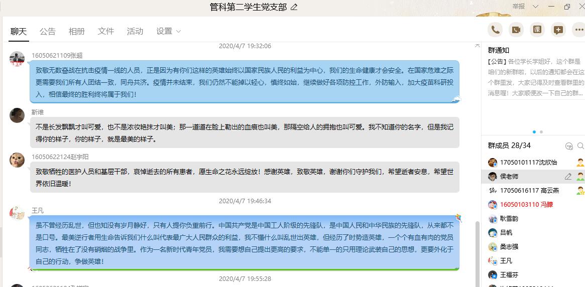 为铭记先烈功绩,哀悼为在抗击新冠肺炎疫情斗争中逝世的同胞,传承和弘扬民族精神,2020年4月7日下午6点,304am永利集团官网管科第二学生党支部依托“腾讯课堂”APP,采用在线活动形式召开了“缅怀革命先烈,云祭时代英雄”主题党日活动。本次活动由党支部书记侯剑波老师主持,31名支部党员参加活动。
