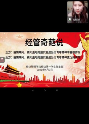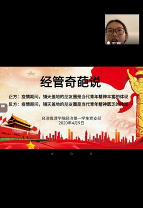 为丰富组织生活会内容,培养学生党员积极思考和团队配合能力、逻辑思考能力、语言表达能力及组织协调能力,经济第一学生党支部于2020年4月9日在线上直播平台开展了本学期第一次辩论赛活动。本次辩论赛以“疫情期间铺天盖地的朋友圈是否是当代青年精神丰富的体现”为主题展开讨论,力求让每一位学生党员能够在疫情期间反思身边朋友圈现象,并深刻领会当年青年的精神风貌。