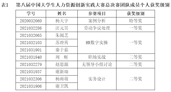 在比赛过程中,人力资源管理专业学生分别在案例分析、劳动争议处理、HR数字实操、职场实战、无领导小组讨论以及实务设计等项目中努力拼搏,分别取得了优异成绩,个人具体获奖级别如表1所示,为取得团体一等奖打下了坚实的基础。