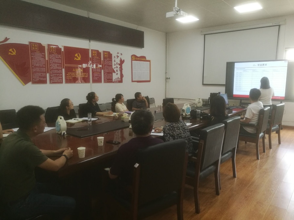 各专业负责人汇报培养方案修订情况,内容主要从培养目标、毕业要求、课程体系、培养方案对标情况、选修课学分比例占比及开设比例情况等七方面展开。