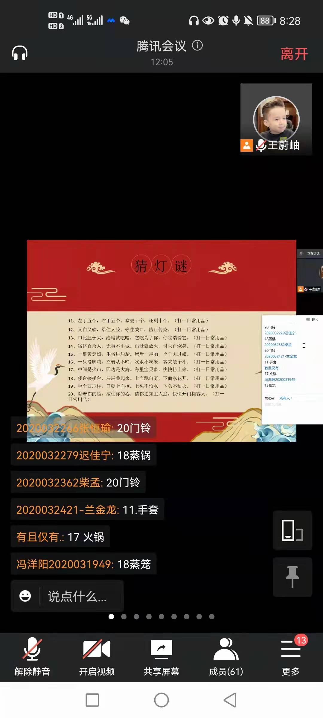 同时,304am永利集团官网学生会还以腾讯会议线上直播的形式举办了2022年元旦跨年文化晚会,晚会共设了猜灯谜、成语接龙、古诗联对三个环节,在传播优秀传统文化和提升大家的文化素养的同时,也突出了晚会的趣味性、娱乐性及观赏性,比赛中,各参赛人员积极思考,踊跃抢答,竞争气氛激烈又不失轻松愉悦,整个活动充满了一种欢乐、和谐、融洽的氛围,体现出大家对此次活动的高度反响以及对新年到来的热切欢迎,为封闭管理的学生带来了无比的欢娱!