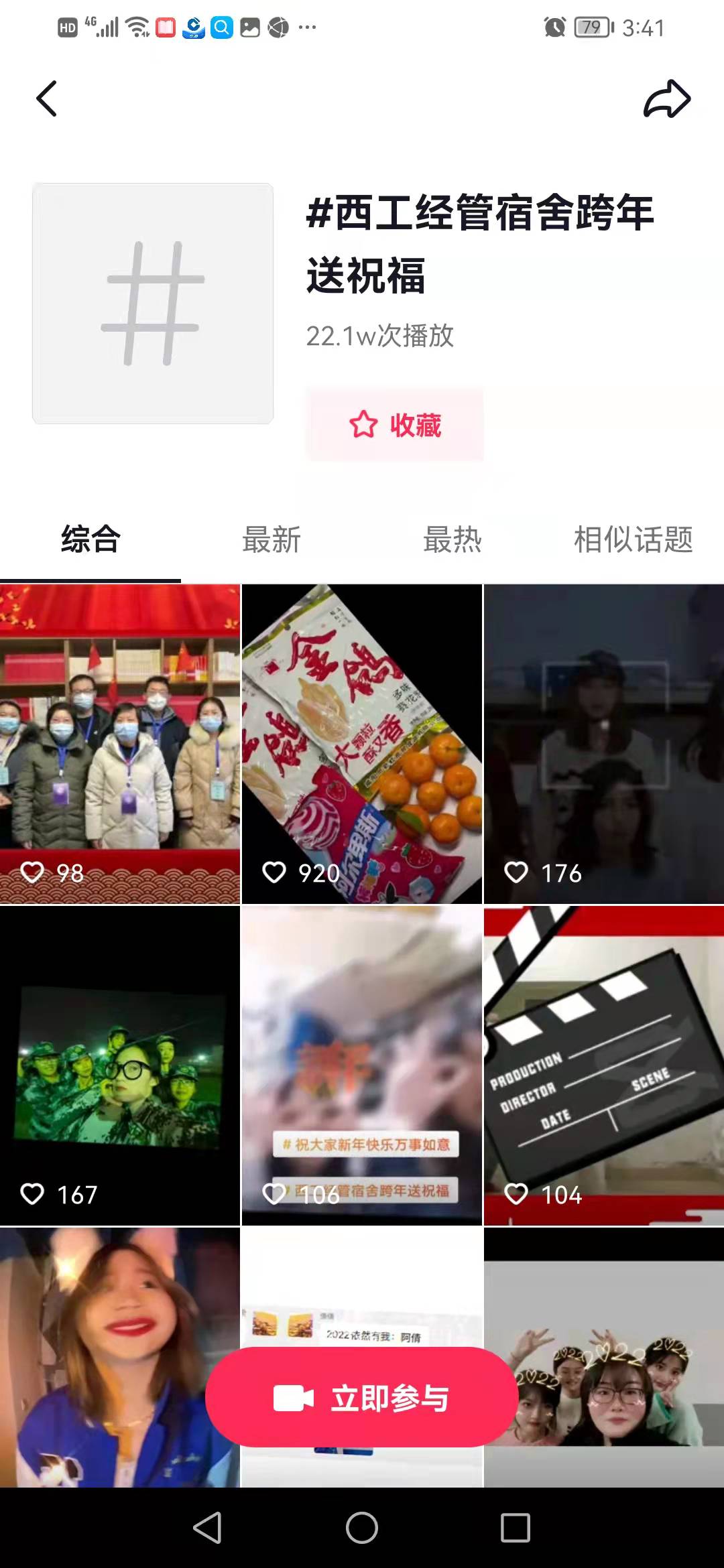 此外,经管学院的“宿舍跨年送祝福”的视频征集活动也在抖音热火朝天的开展起来。同学们在宿舍通过唱歌、跳舞等各显神通推荐自己,在欢庆节日的同时也积极地释放了自己的情绪,截止目前,抖音播放量已累计播放22.1万次,他们在公共平台上展示了疫情封闭时期西宫学子的别样风采!