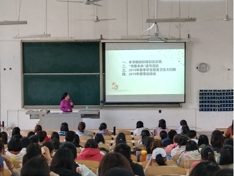 首先,两位老师对上学期同学们的学习、生活、工作等情况进行总结,希望大家能够调整和明确自己的目标,努力奋斗;接下来,对本学期“书香未央”读书活动进行动员,鼓励同学们“多读书、读好书、好读书”;随后,辅导员对春季学生卫生大扫除进行动员和布置,要求同学们认真清扫和保持宿舍卫生环境,养成良好的个人生活习惯,自觉加强个人文明素养养成;最后,对2019年春季运动会相关工作进行安排,希望同学们在运动会中勇于拼搏,展示良好的精神风貌。