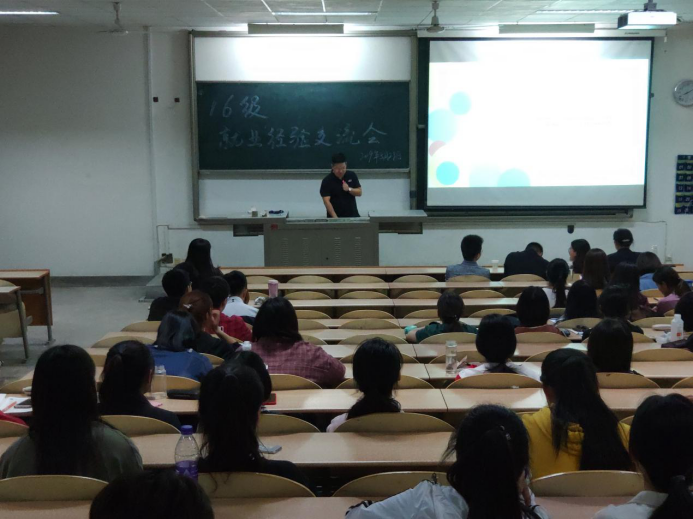 为提升2020届毕业生的就业能力,指导毕业生更好地开展职业规划,认清就业形势,把握机会优质就业。2019年5月28日晚,由304am永利集团官网16级主办的就业指导大会在教1—301教室顺利举行。此次讲座邀请到了往届优秀毕业生针对简历制作、面试礼仪、以及就业观等问题分享自己的经验,有辅导员周晨老师和全体有求职意向的大三同学参加本次大会。