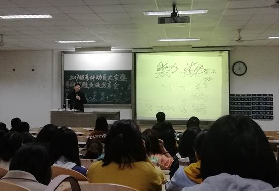 讲座伊始,短片《考研人的一天》拉开了序幕,同时也展现了考研人忙碌而又充实的一天生活,把大家慢慢带入奋战考研的氛围。随后,多名理解考研成功的研究生同学向同学们分享了自己的考研经验和复习策略。随后具有多年考研辅导经验的韩苏老师通过一堂考研实战课程让同学们真正体会了一把考研学习的内容。幽默的讲课风格总能使课堂笑声此起彼伏。大家在轻松的环境下学到了之前不曾注意的各种英语小知识,让大家对考研不在那么畏惧,而是更加充满信心。最后,老师对考研相关方面又进行了重点强调,为大家考研准备增加信心和支持。鼓励同学们要做到理想坚定,信念执著,不怕苦难,顽强拼搏,永不气馁。