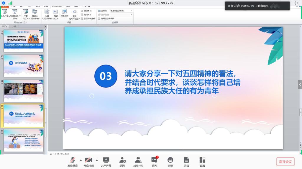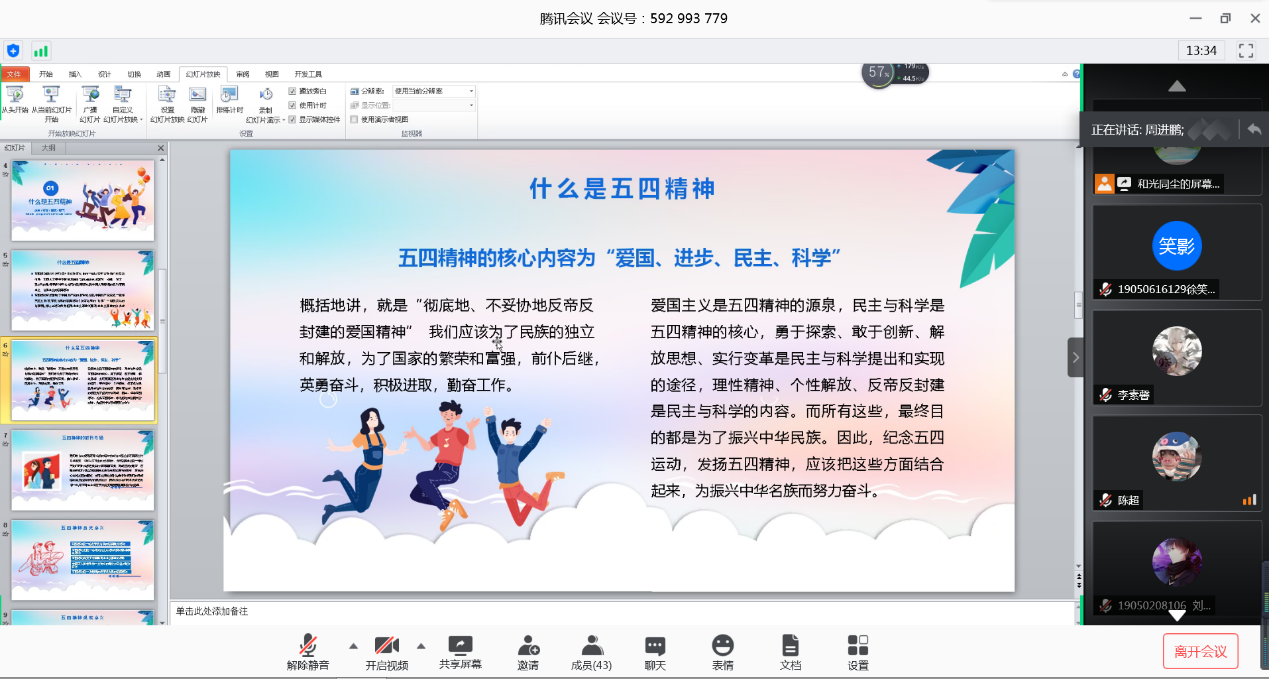 在之后的交流分享中,大家发言踊跃。刘网玥同学提到,每个时代的青年都有每个时代的使命,五四精神的内涵是爱国主义精神,我们要将这种精神转换为一种行动动力,我们心中有感悟,脚下有行动,才能实现青年为祖国建设的目的。我们需要这种精神来激励自我,我们青年也需要团结在一起,为同一个理想追求奋斗。时代赋予的责任我们是要义不容辞肩负起来的,更应该以爱国之情助力现实追求。同学们或达着自己对于五四精神的理解,或表达着对祖国的热爱、对责任的担当、未来的憧憬。朝气蓬勃,催人奋发。