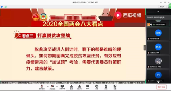 随后,全体团学干部观看了2020两会的相关视频。通过视频学习,全体成员深入了解到现在生活中所享受到的一些利民政策都离不开历年召开的两会中代表和委员们的提案与建议;通过两会八大看点的视频学习,全体成员知晓了2020两会关于疫情防控、经济发展、民生保障等热议话题的讨论与分析;通过国务委员兼外交部长王毅答中外记者提问的视频学习,所有人都看到了中国“云外交”模式下的中国态度以及中国致力于与世界各国共建人类命运共同体的决心。
