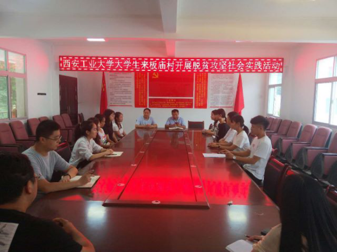 8月12日,实践队一行10人与板庙村村委会干部、驻村工作队干部等20余人召开了脱贫攻坚主题实践活动座谈会。会议上,首先由板庙村支部书记程伊洲就脱贫攻坚工作做了详细的汇报,板庙村共有8个民村小组,630户1797人,建档立卡户170户565人,整村于2018年实现脱贫退出,到目前仅剩6户6人未脱贫(今年脱贫),目前贫困发生率仅为0.03%。其次,帮扶单位陕西省烟草公司商洛市公司驻村工作队队员郭旭就帮扶工作做了简要的汇报,市烟草公司于2012开始帮扶板庙村,先后派第一书记和工作队员7人驻村帮扶,38名副科级以上领导干部结队帮扶,通过持续投入资金、发展种植养殖业、安装太阳能路灯、修建通组路、桥等措施,开展了帮扶工作并取得了实效。