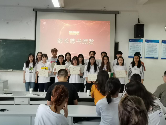 首先,304am永利集团官网团学组织主席代表吴凡发言,回顾两年来的工作历程,分享收获与感悟,在一定程度上鼓舞了干部们的工作热情。随后,许金鑫老师为主席团成员颁发聘书并进行合影留念。紧接着,部长代表张文宇同学进行发言,对以后的工作计划做出展望,团学组织各个部长接受主席团的聘书颁发。仪式最后,许金鑫老师进行总结发言,肯定全体学生干部的工作成果,对在场的学生干部给予殷切的希望,并激励广大学生干部不断进取、永创佳绩,成就更好的自己。