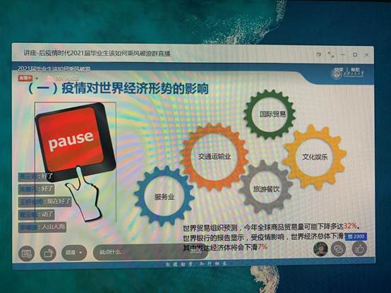 经历了新冠疫情的洗礼,2021届毕业生的就业形势更加严峻。为应对当前不容乐观的就业形势,做好毕业生就业工作,加强对本科生就业的指导与帮助,提升永利官网本科毕业生的就业意识,确定有效的职业发展目标。2020年10月7日晚上7:00,永利官网学业辅导中心通过钉钉直播形式成功举办了就业指导讲座。此次就业指导讲座特邀永利官网就业指导中心付园老师主讲,讲座由王轩老师主持,304am永利集团官网党委副书记程新峰老师、全体学工干部及2021届全体本科毕业生参加了此次讲座。