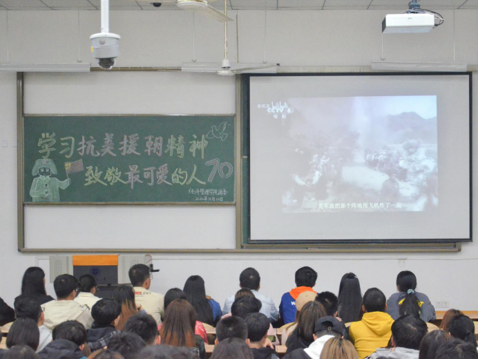 温迪带领同学们回顾历史,了解抗美援朝战争的相关历史知识,随后学习抗美援朝精神:爱国主义精神、革命英雄主义精神、革命忠诚精神、国际主义精神。青年学子一起了解抗美援朝故事,学习抗美援朝英雄事迹,观看抗美援朝纪录片,通过影片了解那个时代“最可爱的人”。团委书记许金鑫在总结讲话中希望同学们能够永远铭记战斗和牺牲的志愿军战士们,继承弘扬伟大的抗美援朝精神,在不断奋斗拼搏中续写新的荣光。