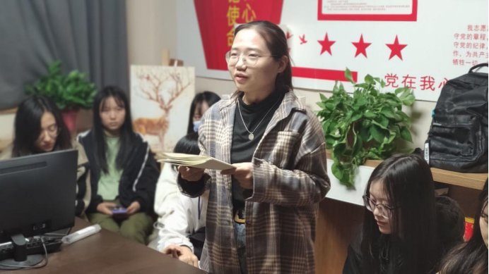 活动伊始,刘翔讲述了开展本次学习活动的目的及意义。随后,第一组成员观看了《平“语”近人》系列视频。视频中,主持人着重阐述了习近平总书记身体力行切实做事的事迹,同时就习近平总书记在重大会议中引用的诗句:“一枝一叶总关情”做了具体讲解。小组的同学们认真观看视频内容,观看结束后吴晓芳同学进行了自我感悟的分享,她说道,通过视频来学习党的思想相比于书面上更生动,理解更加透彻,认识到了党员干部是如何把工作落实到老百姓生活的方方面面的。