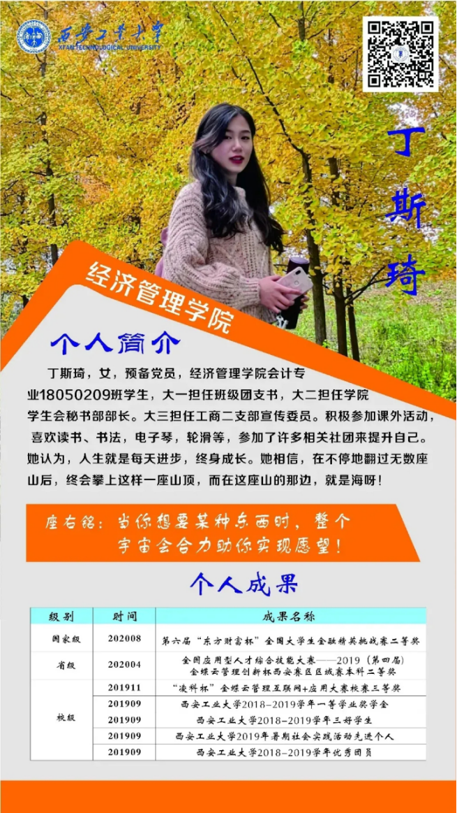 丁斯琦,女,预备党员,304am永利集团官网会计专业18050209班团支书,曾获第六届“东方财富杯”全国大学生金融精英挑战赛二等奖,在校期间共获省级奖项1项、校级奖项5项。