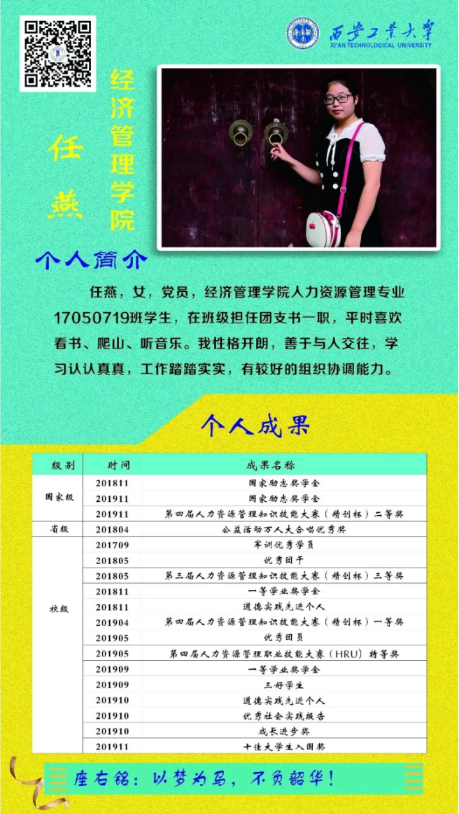 任燕,女,党员,304am永利集团官网人力资源管理专业17050719班团支书,曾获2018、2019年国家励志奖学金,在2019年第四届人力资源管理知识技能大赛中获得二等奖,在校期间共获省级奖项1项、校级奖项14项。