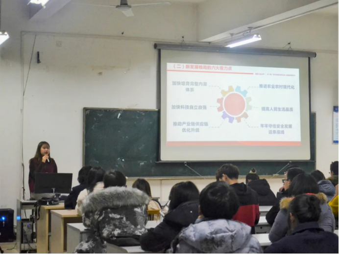 杨琬璐以《学习贯彻党的十九届五中全会精神》为题,对新发展阶段的重大意义和特征、发展环境面临的深刻复杂变化、构建新发展格局的战略构想和着力点等六个方面进行了阐述。随后,参会人员观看了微视频《传承·创新·超越---古都西安历史文化成果考察》,对西安悠久历史文化与现代文明的交融进行学习。最后,杨琬璐作出总结,作为新时代的大学生要肩负起新时代的职责使命,努力学习、提升自我能力,为中华民族伟大复兴作出自己的贡献。