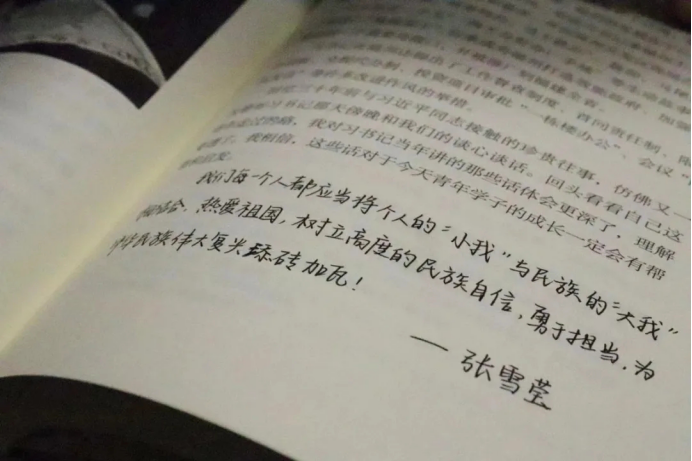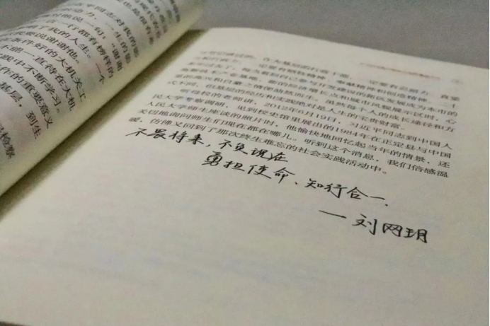 知未研习社组织入党积极分子再教育活动,以《习近平与大学生朋友们》为主要内容,引领广大入党积极分子向党组织靠拢。“不畏将来,不负现在;勇担使命,知行合一”刘网玥同学读完后在书本上写下了这样的箴言。