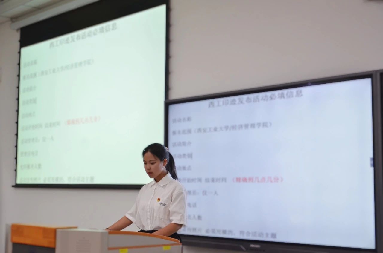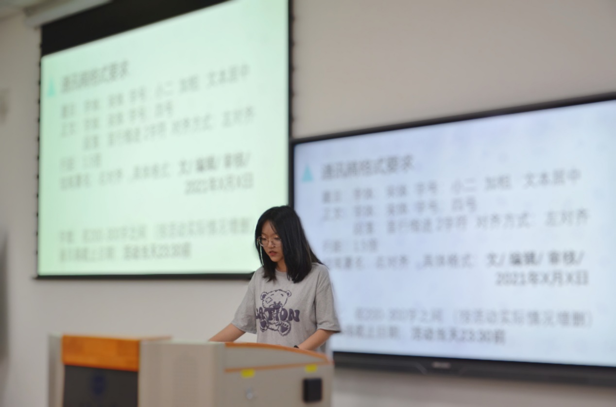 紧接着记者团徐一诺为我们进行通讯稿写作培训,她表示撰写通讯稿时应严格注意格式与内容排版,并强调了图片拍摄时的注意事项。