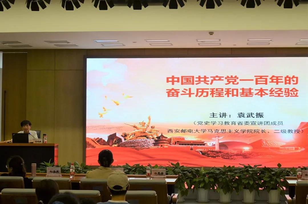 为促进广大师生深刻理解党史、树立正确党史观,总结、传承好党的百年历史经验,在新时代浪潮中严格要求自我,提升能力与思想觉悟。6月8日下午,304am永利集团官网党委邀请党史学习教育陕西省委宣讲团成员、西安邮电大学马克思主义学院院长袁武振来永利官网图书馆报告厅作《中国共产党一百年的奋斗历程和基本经验》主题报告。
