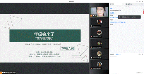4月14日晚,“生命里的爱”主题年级会议顺利在腾讯会议上召开,20级人力资源管理专业全体学生参加。本次会议由辅导员老师石慧敏主持,会议内容主要参考学工部2022年3月31日开展的礼赞生命主题教育培训。