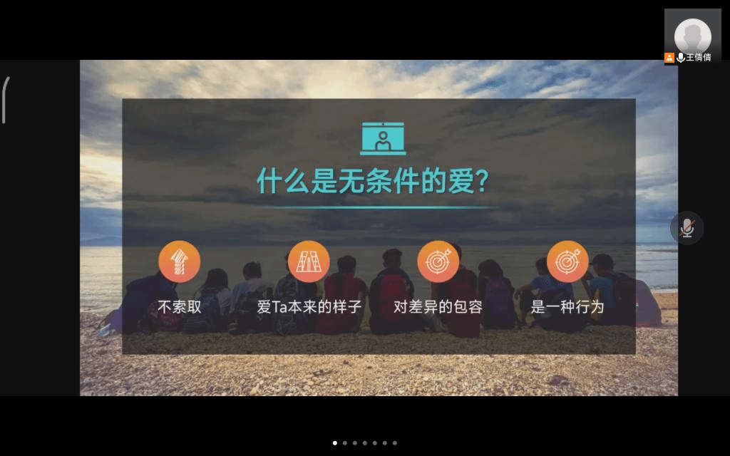 首先,活动以一段抗疫纪录片向大家展示了疫情期间大家守望相助、鉴定胜利信念、武汉成功清零、抗击疫情取得阶段性胜利的画面,拉开本次活动的序幕。随后,通过讨论海伦·凯勒的案例,引发大家回忆并讨论“我们生活中感受过的爱”,同学们积极发言,诉说着一个又一个充满爱意的温暖回忆。随后,向大家介绍了约翰·威尔伍德所著的《完美的爱,不完美关系》,阐述了作者在处理自身关系时的三个原则,引导同学们探讨:在自己与他人以及在亲密关系中的交往应该遵循什么原则;最后也是最重要的问题,通过询问同学们,在生活中我们应该怎样去爱?如对父母,对朋友,对恋人......同学们畅所欲言,百家争鸣。在活动的末尾,王倩倩说到,其实最朴素的爱就在我们身边,我们的父母、亲朋都只能在有限的时间里陪伴我们,所以我们每个人更应该好好珍惜每一天,去向他们表达生命里的爱。
