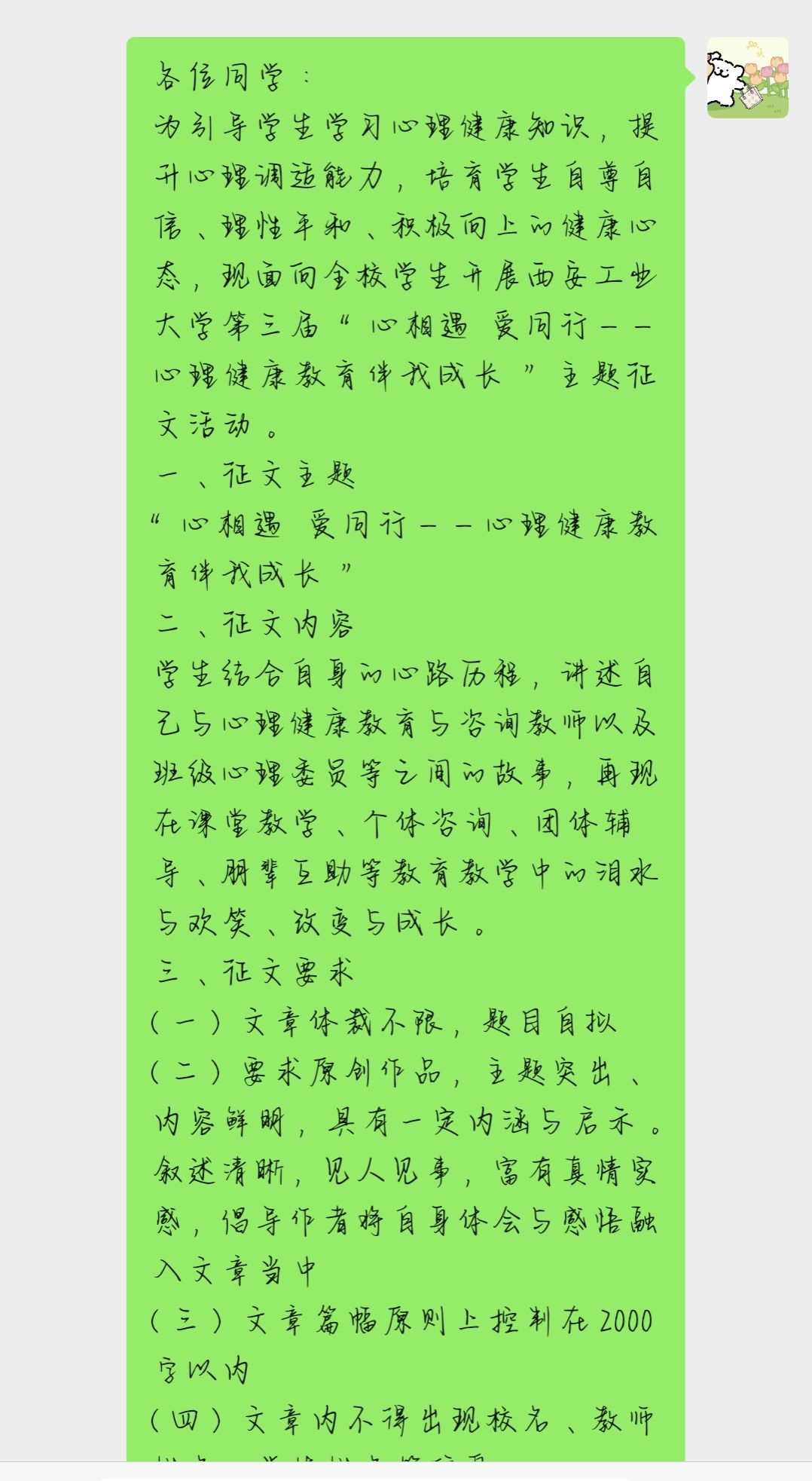 为引导学生学习心理健康知识,提升心理调适能力,培育学生自尊自信、理性平和、积极向上的健康心态,在3月22日至4月1日,面向全校学生开展了304am永利第三届“心相遇,爱同行——心理健康教育伴我成长”主题征文活动。活动期间,众多学生积极踊跃地报名参与。